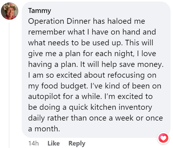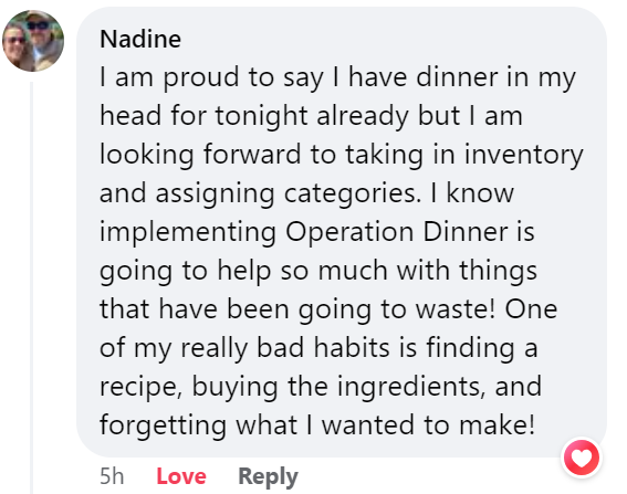 Every member starts with Operation Dinner - how to meal plan (and follow through) in 5 minutes. We eat dinner every day, and when you know what's for dinner, you have more brain power and energy to work in other areas (like "How Much Should You Spend on Groceries" or "Buying in Bulk with Sale Cycles").